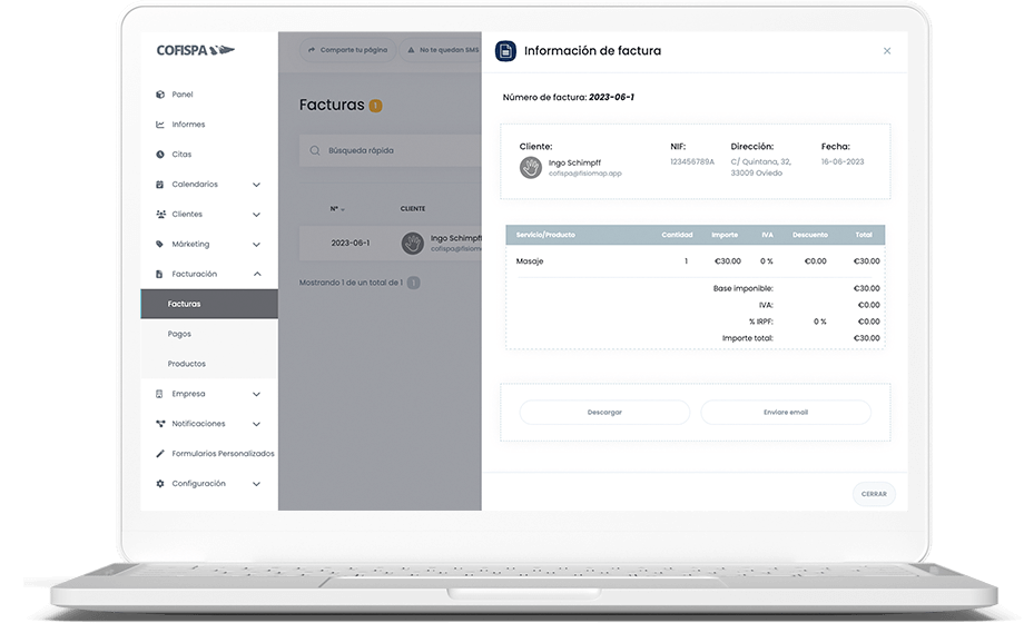 Con Fisiomap tienes acceso a una solución de facturación completa, adaptada a la normativa española más reciente. Y ahora, para los colegiados de COFISPA, integra la compatibilidad con VERI*FACTU - el sistema obligatorio de emisión de facturas verificables establecido por la Agencia Estatal de Administración Tribuataria (AEAT) que garantiza la trazabilidad, inalterabilidad y seguridad de los registros de facturación.
